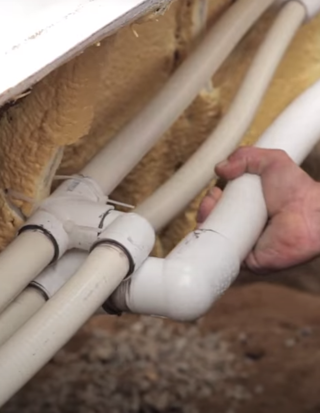 - Starting by making a first connection of the pipes gives the glue a chance to dry in preparation for the installation of the basin.