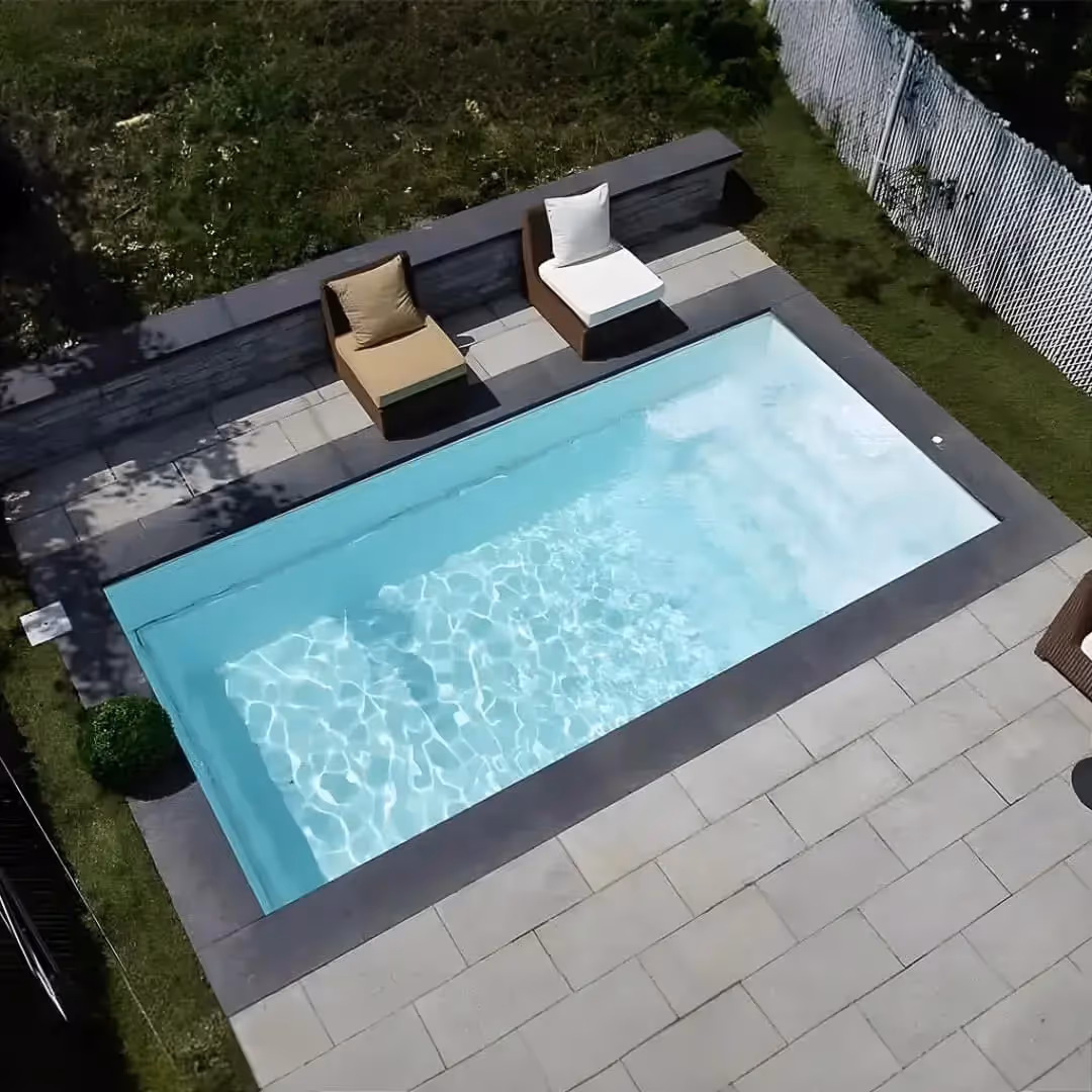 The F-24 features a flat bottom and a sleek, modern design, perfect for relaxed swimming and contemporary outdoor spaces. Build your ideal fiberglass pool and see how the F-24 fits your backyard layout.