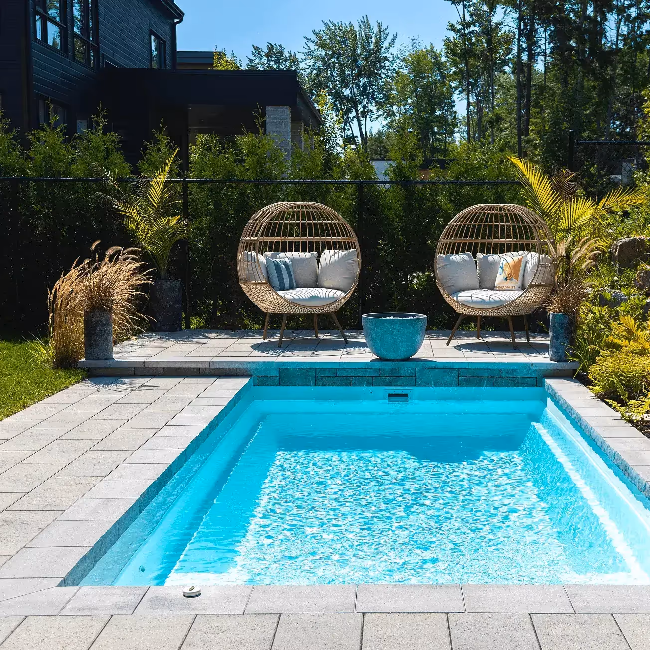 Contemporary model offering a simple and zen look, this flat-bottomed pool is easy to maintain in addition to offering space and functionality. Its spa area promoting relaxation in all points is equipped with 4 adjustable jets.