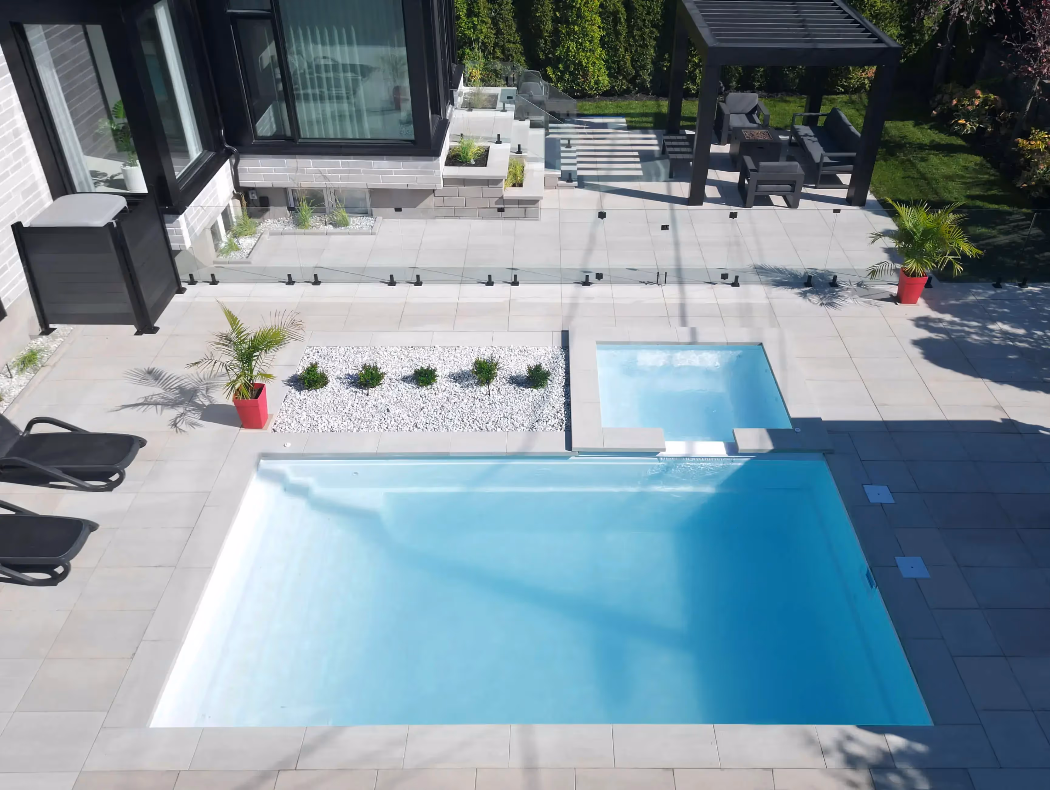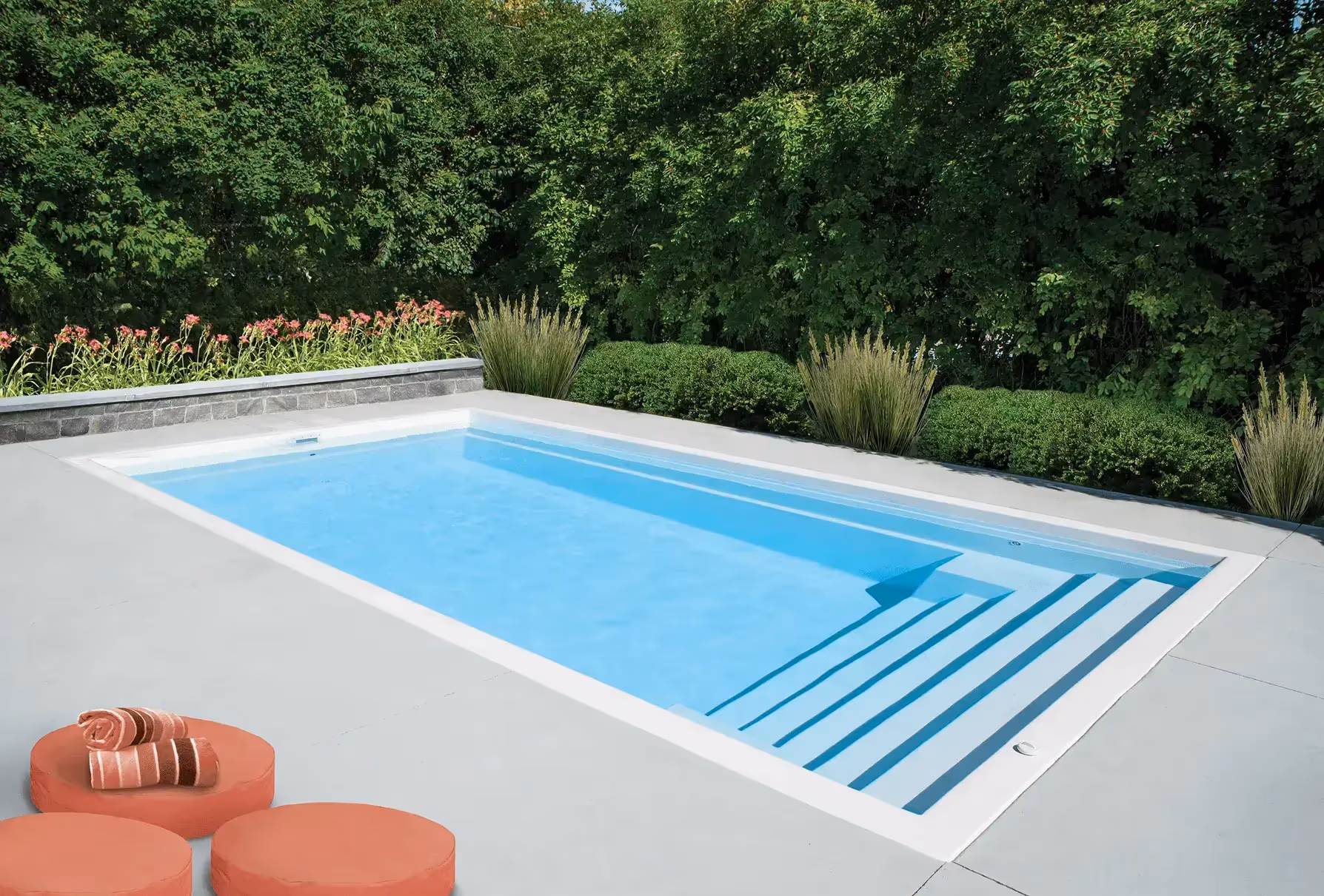 The F-29 features spacious, full-width stairs that add modern style to your backyard. Its flat bottom will maximize your bathing area. Design your fiberglass pool with the F-29 and pick the options that work best for your space.