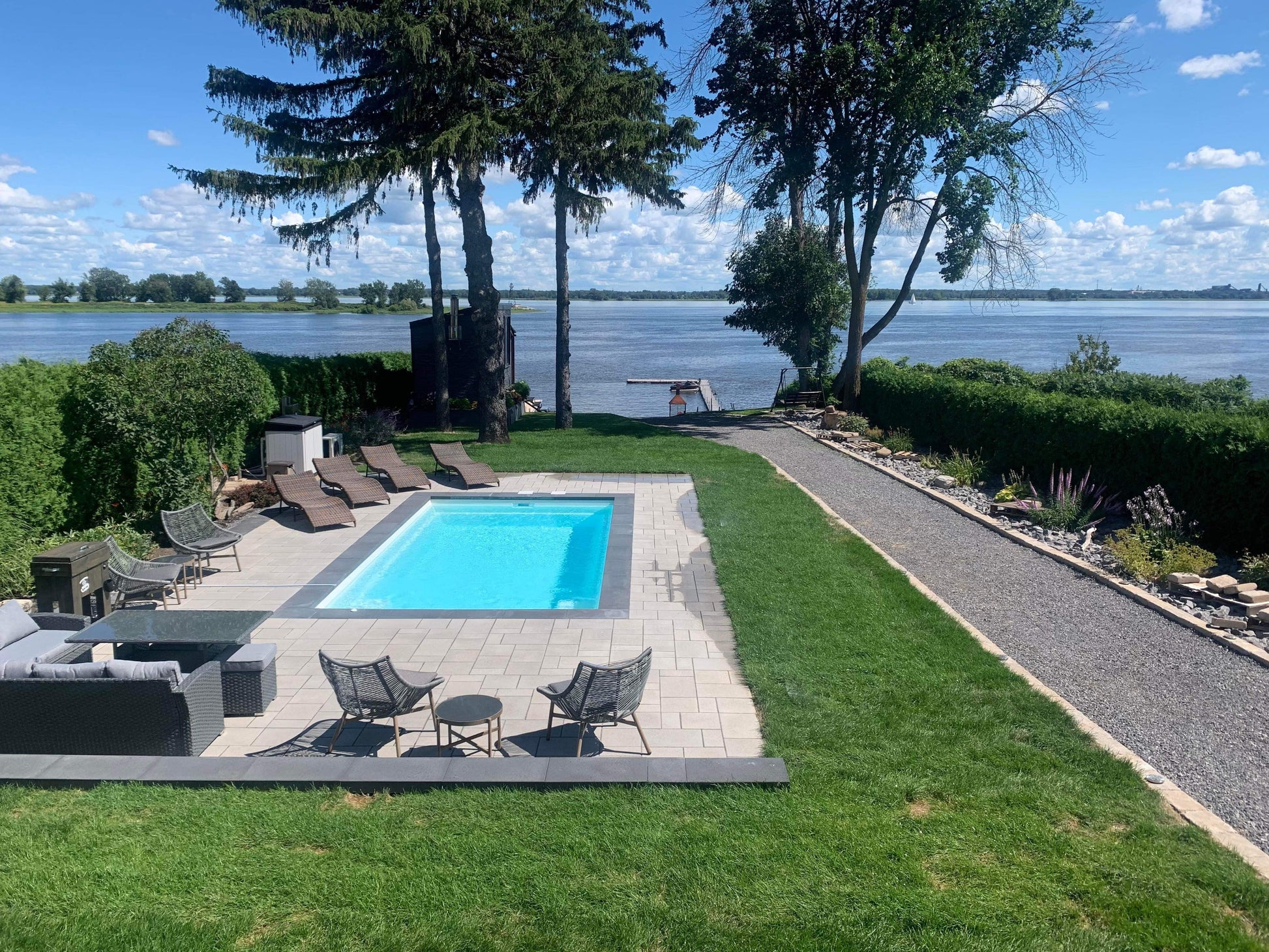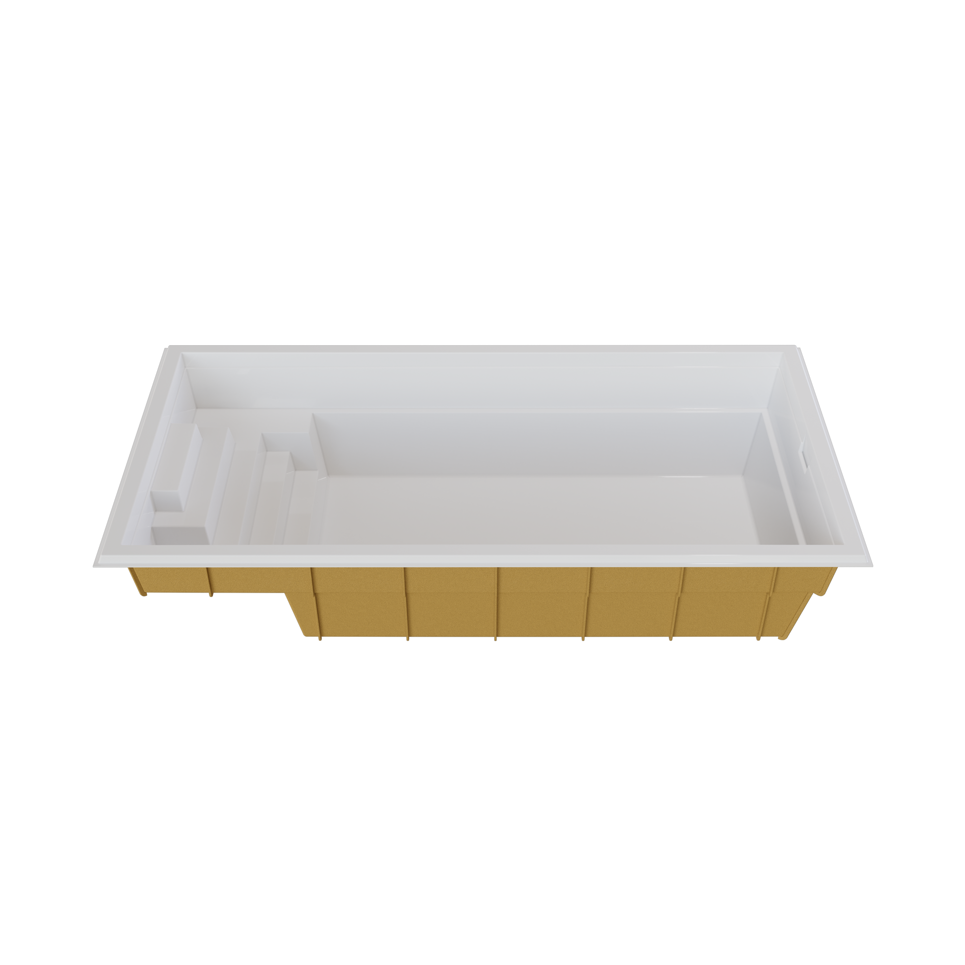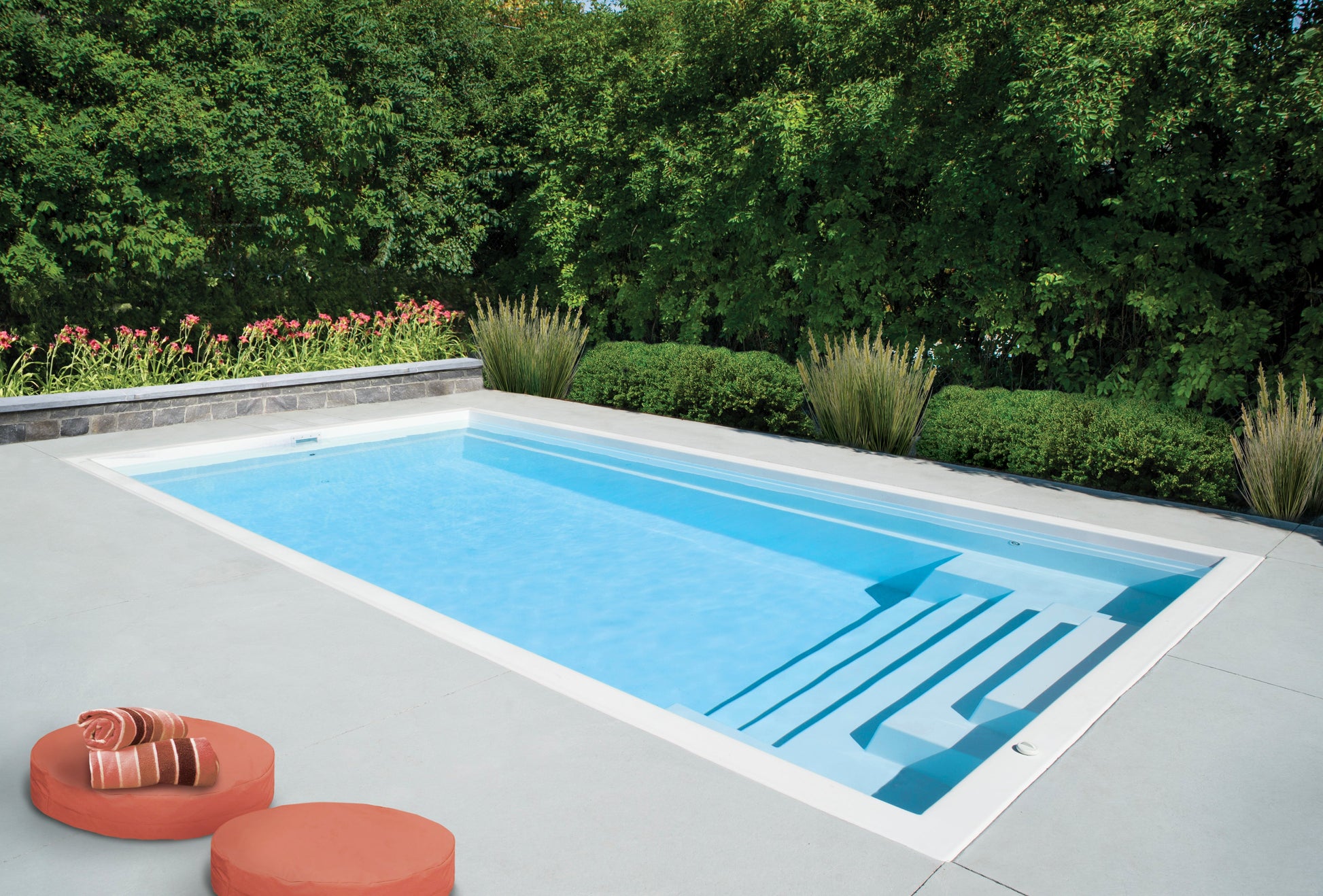 Perfectly integrating with all outdoor courtyards, this pool also follows the clean and linear trend. It has a spacious walking descent as well as whirlpool jets for relaxation. Its flat bottom maximizes the swimming area.